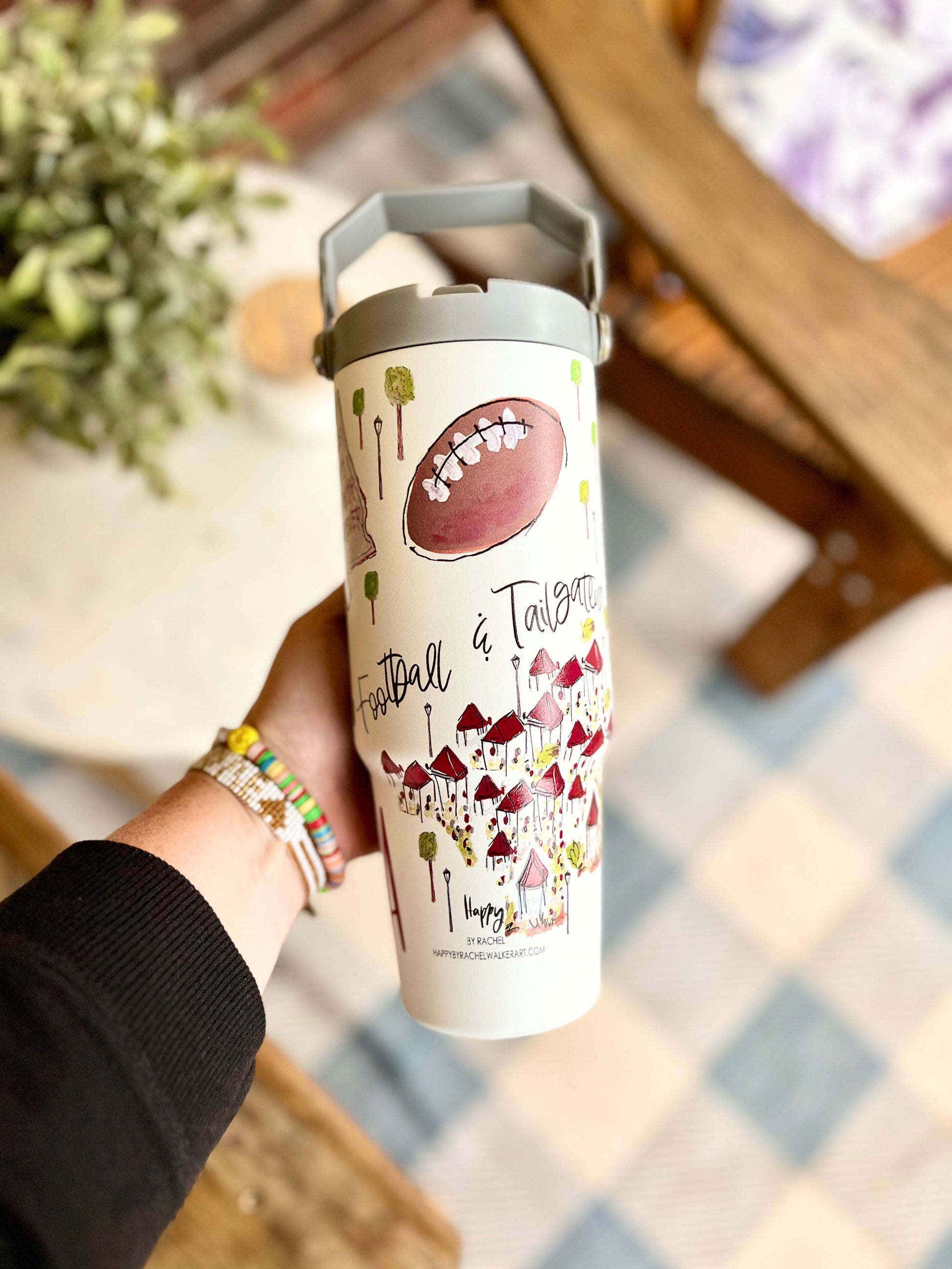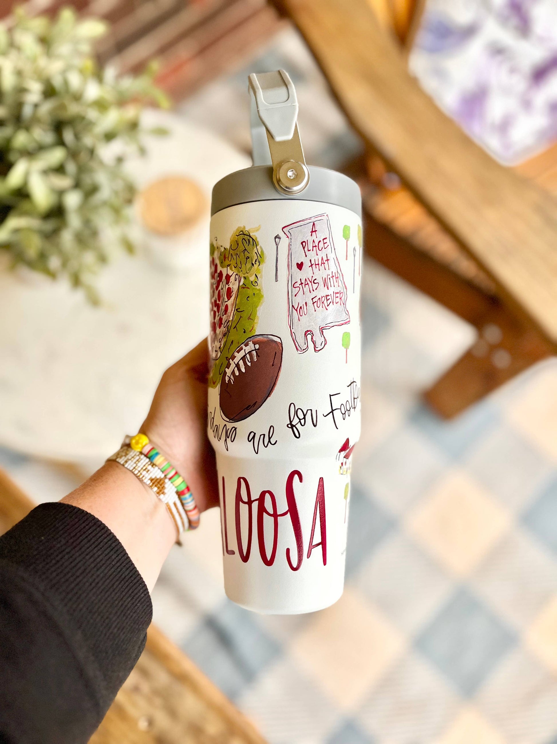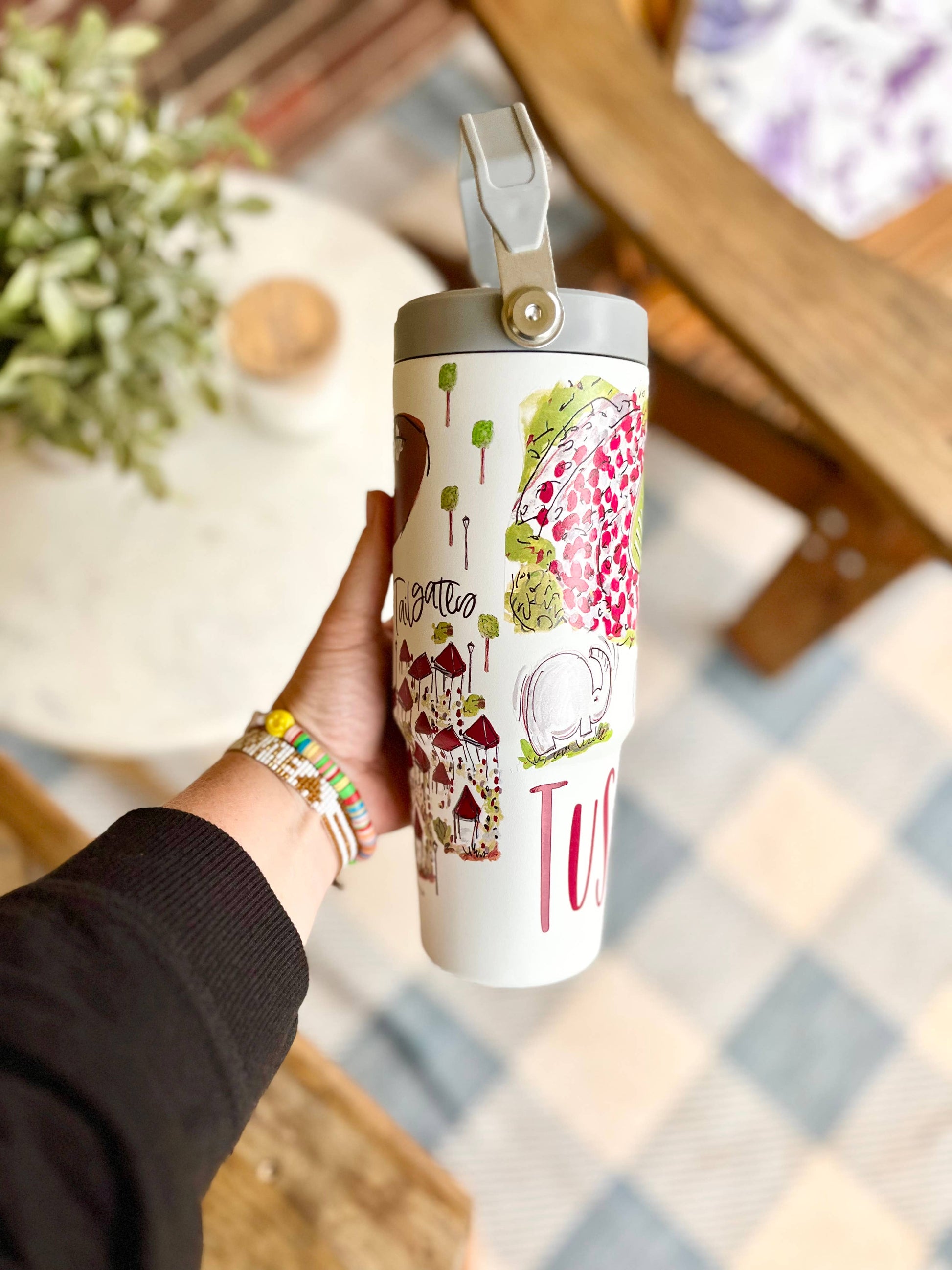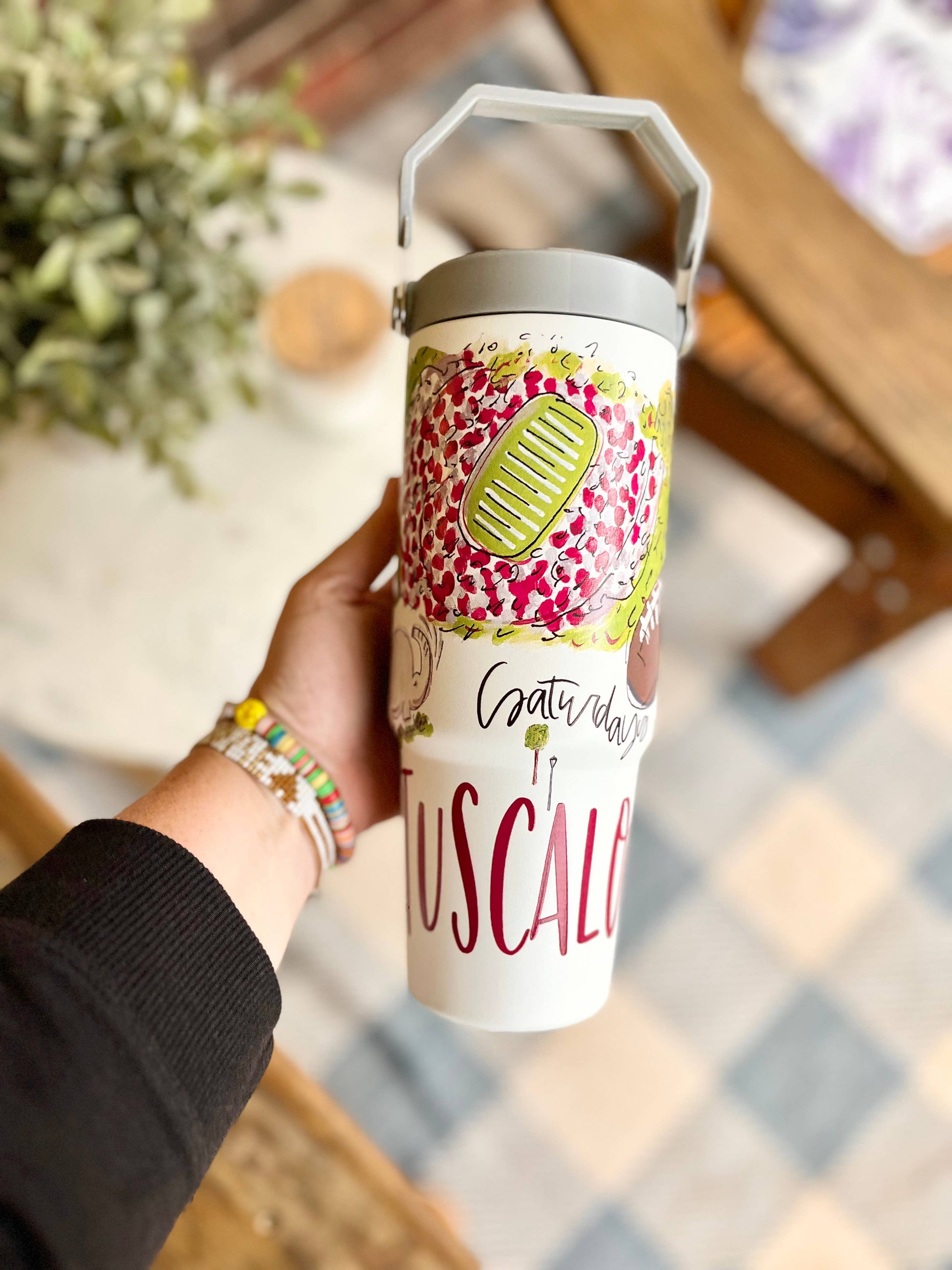 Pre-Order now! These 30 oz tumblers are sure to turn heads! Cute tumbler with one of a kind art work displaying all the things that make Tuscaloosa so special on a Saturday! Comes with a flip lid and a handle making this 30 oz drink perfect for on the go and extra easy to carry! Designed by Rachel Walker.