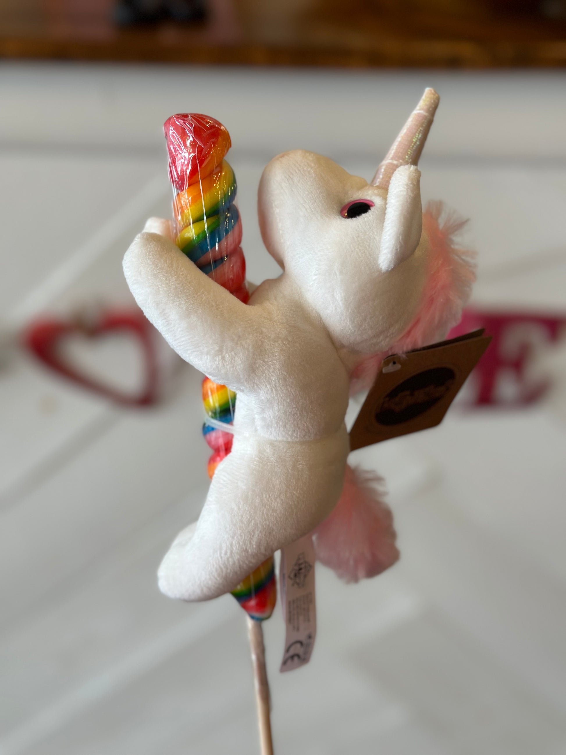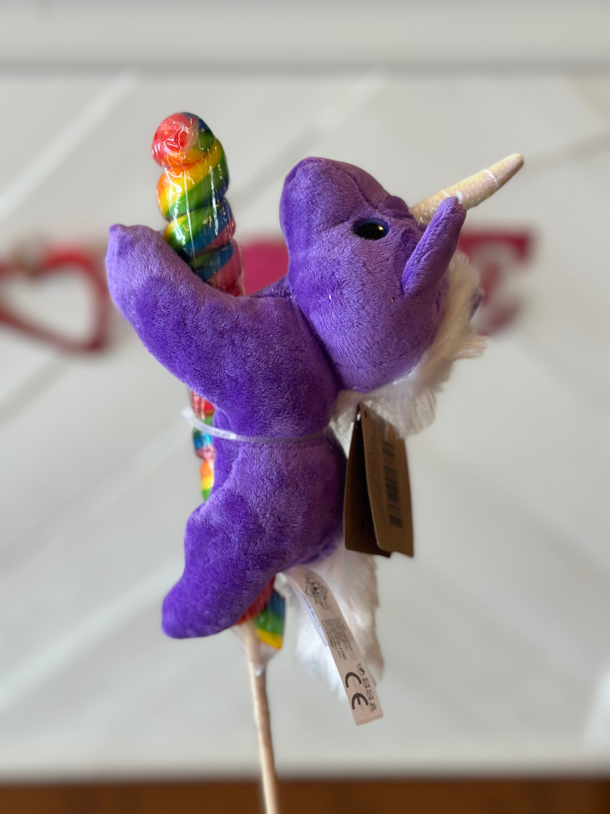 Whimsical unicorn with delicious rainbow lollipop. Three color options are available: purple, pink, or white unicorn with sparkling horn and mane. This unicorn plush toy with lollipop is irresistible. Plushie unicorns made out, of recycled material and hugs a rainbow colored lollipop. The plush is 6" long, the lollipop with wooden stick is 14" long, from top to bottom. This small stuffed animal unicorn hugging a rainbow lollipop is the perfect size and the ideal gift for girls of all ages.