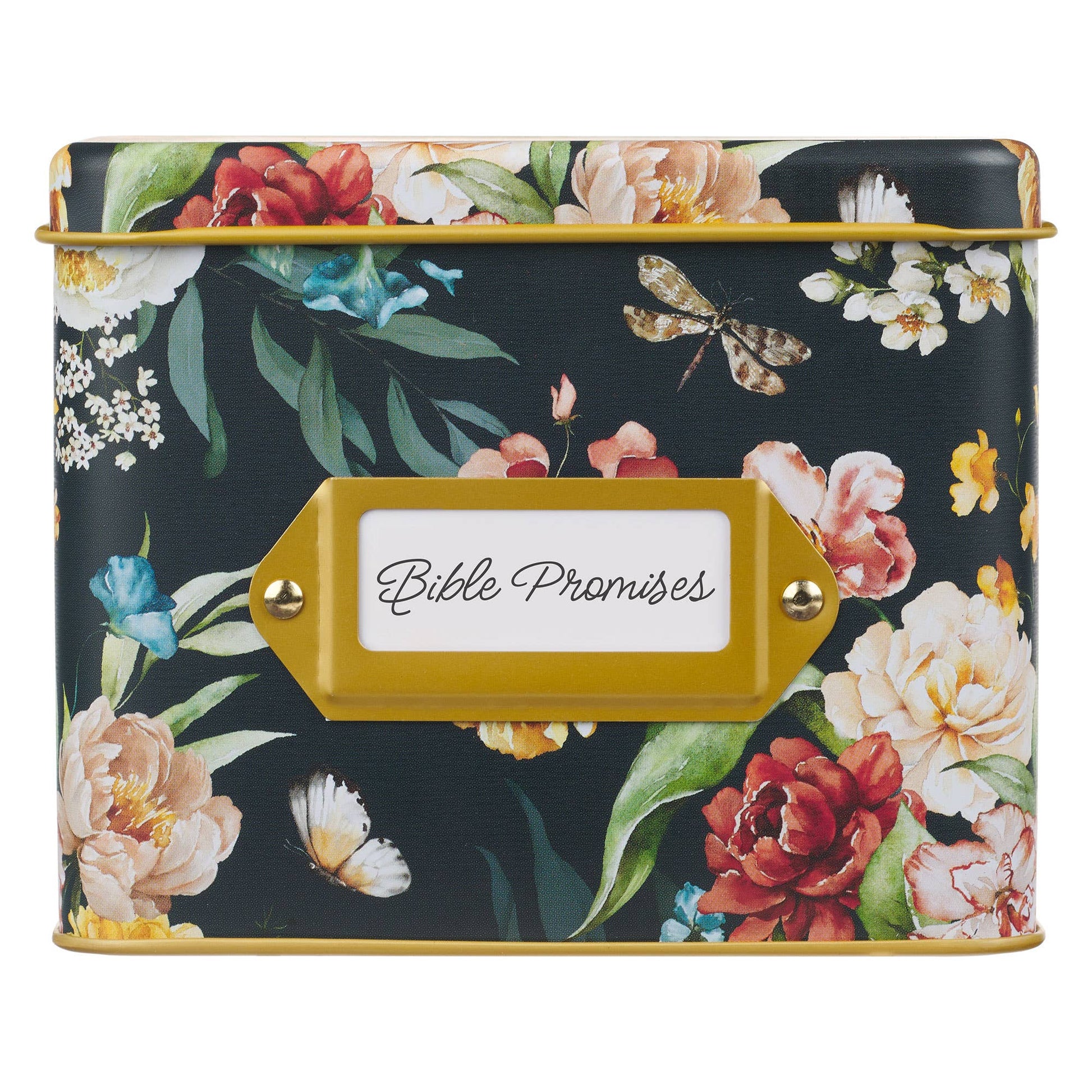 Black background with large flowers, Metal tin with a tight-fitting lid, Brass bracket with label, Hinged lid, 50 double-sided cards, Bible promises on the front, Lines space on the back, Card size: 4.4" x 3.5" (112 x 89 mm), Tin size: 5.2” x 4.1” x 2.4” (132 x 104 x 61 mm)