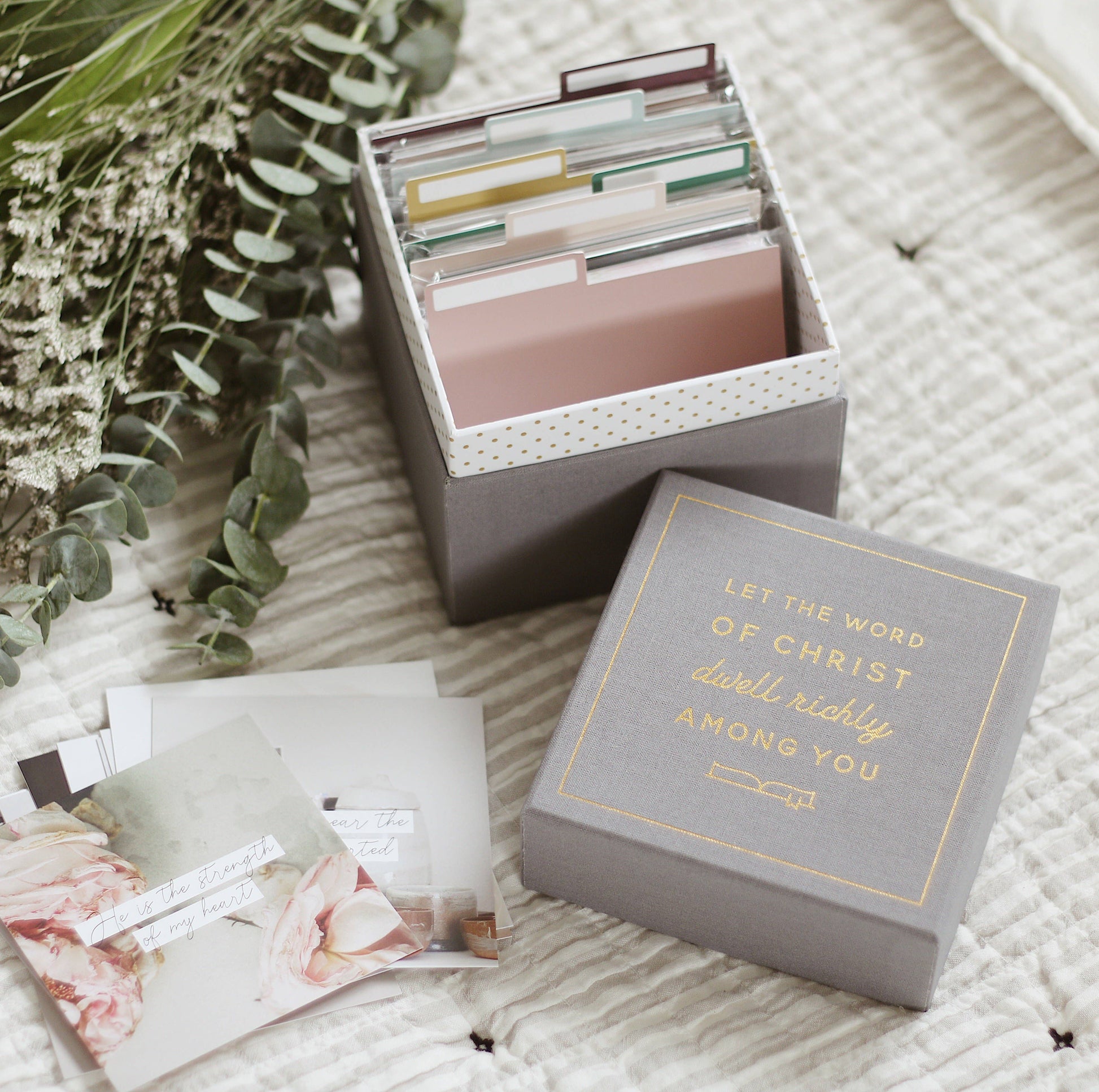 The Dwell Verse Card box is a gray linen covered box with gold foil accents that fits our 4x4 Scripture memory and prayer cards.