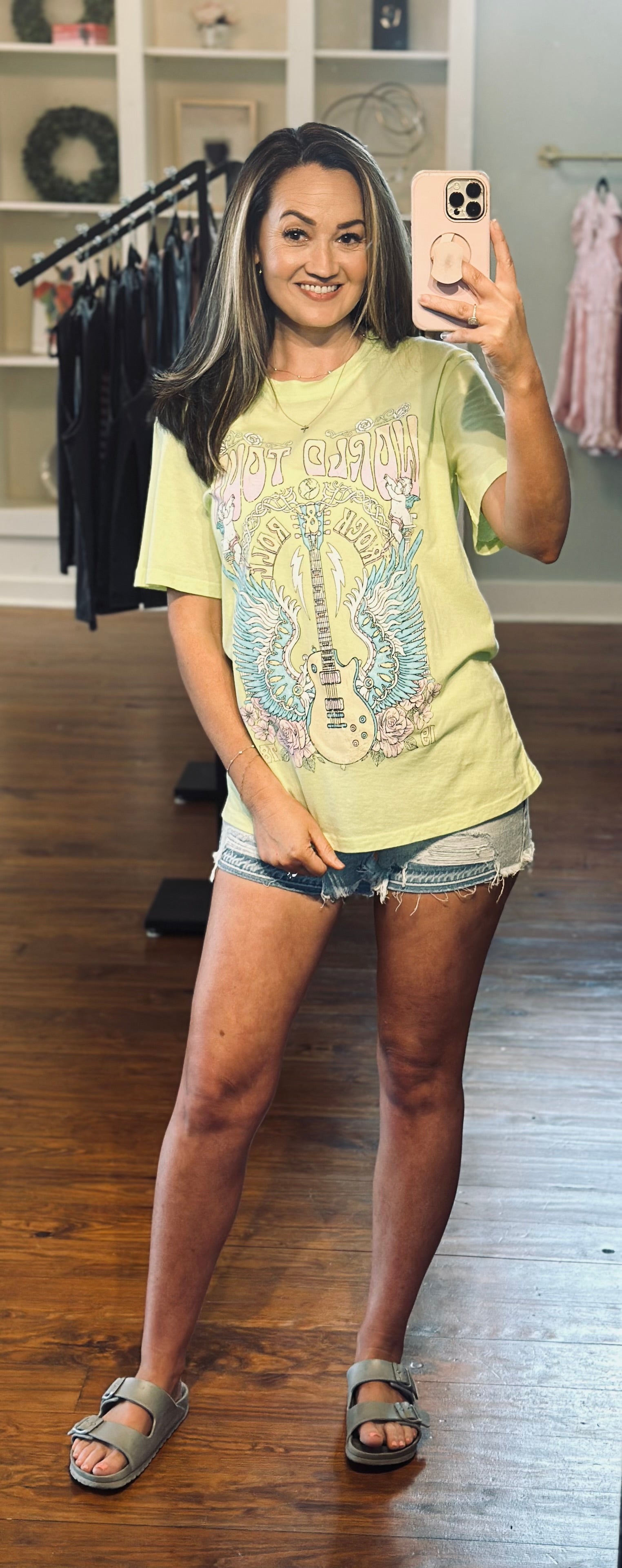 Experience comfort and style with the Electric Lime World Tour T-Shirt, crafted from premium washed cotton for a super soft feel. Its muted lime color offers a subtle yet distinctive look, perfectly complemented by a vibrant vintage rock n roll graphic. This tee combines classic design with modern comfort, making it an essential piece for any music enthusiast’s wardrobe.