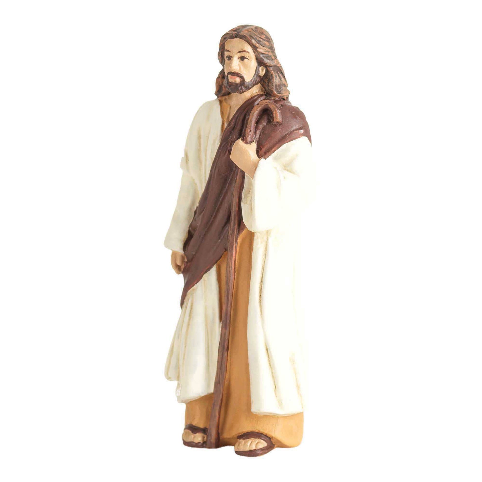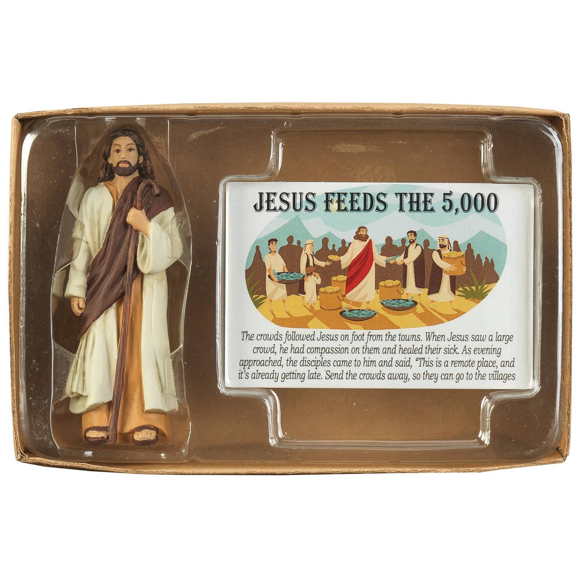 Gift boxed set includes a 3" high Jesus with shepherd staff figurine, along with a 3" x 2" Itty Bitty Blessings card displaying the Bible story Jesus Feeds the 5, 000 from Matthew 14 over the front and back, along with To and From spaces on back. Figurine is resin. The set is securely packaged in a clear vac tray, in brown Kraft tray box with clear lid. Box measures 3 3/4" x 5 1/2" x 1 3/8".