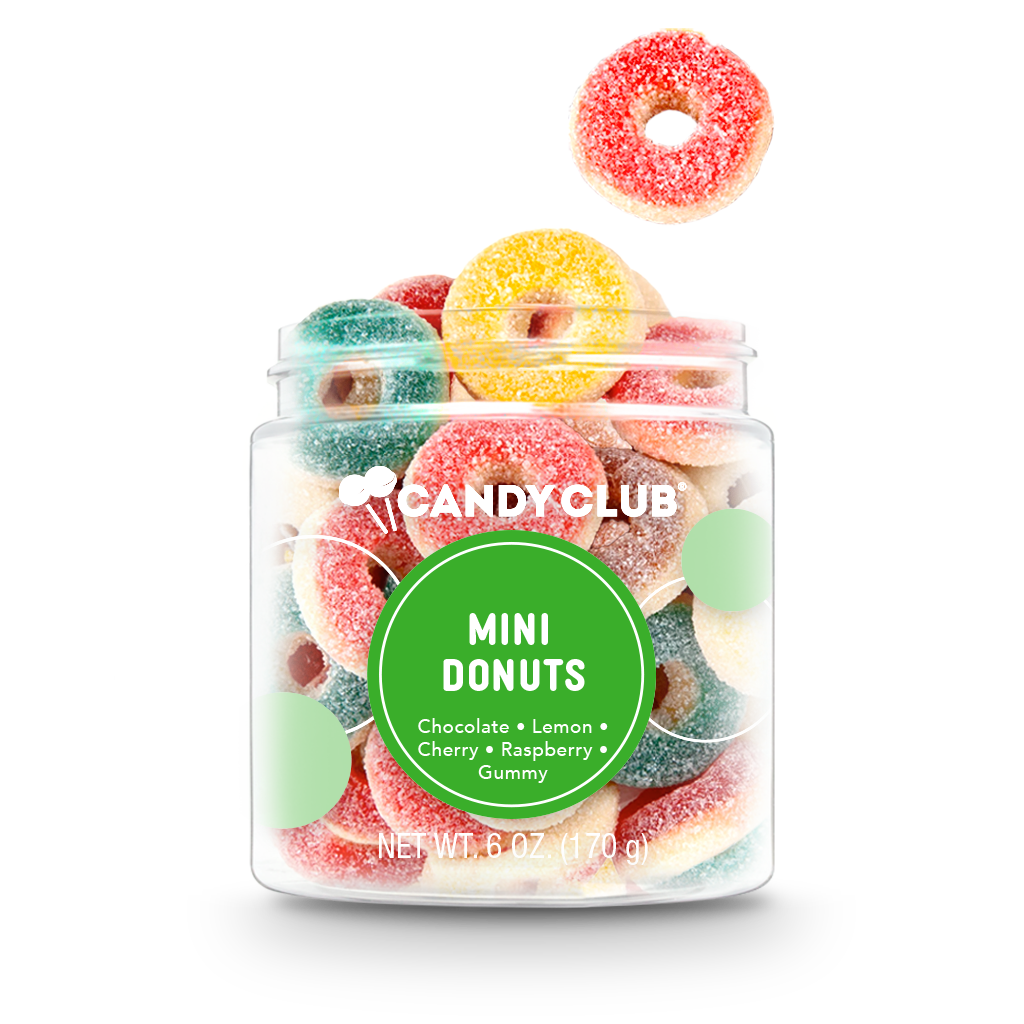 Mini gummy 'sugared' donuts in delicious mix of chocolate, cherry, lemon, raspberry and cream flavors.