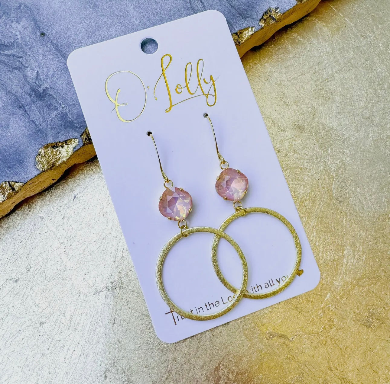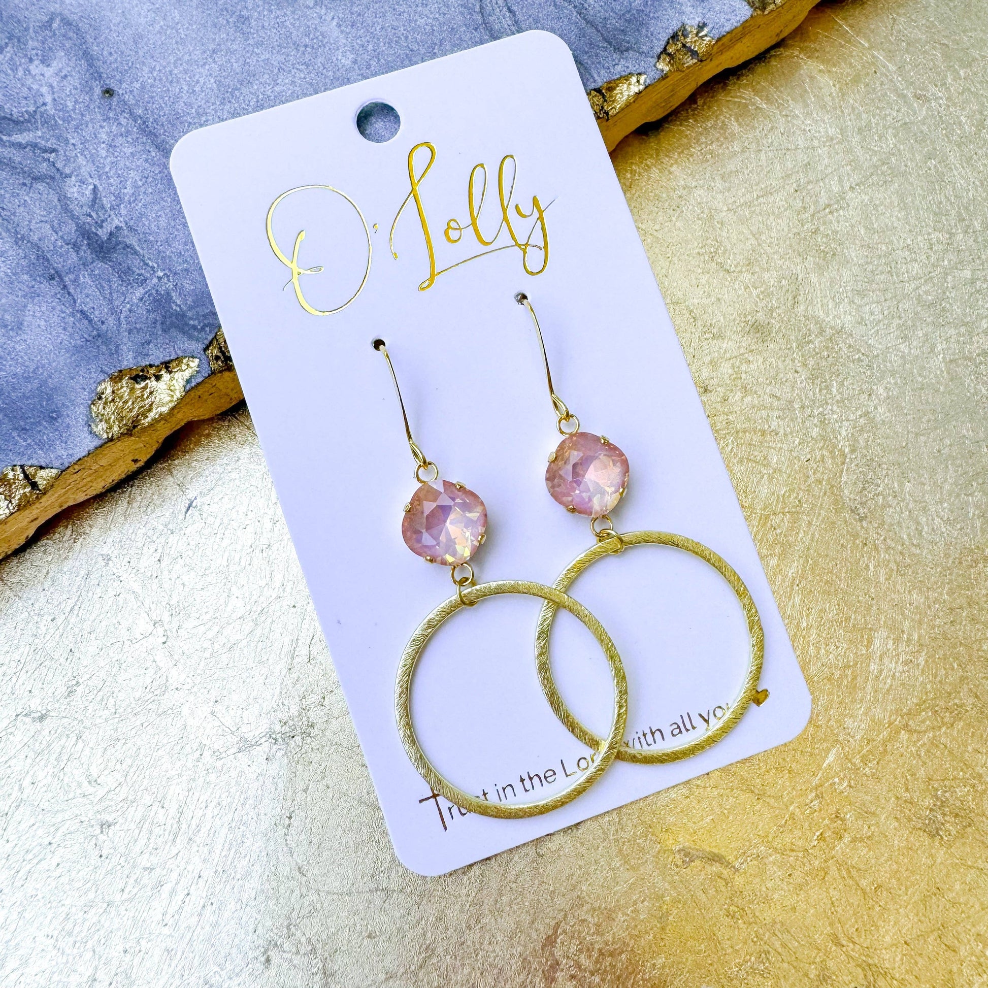 Pink colored crystal stone with gold textured hoop. Approximately 2.5” long.