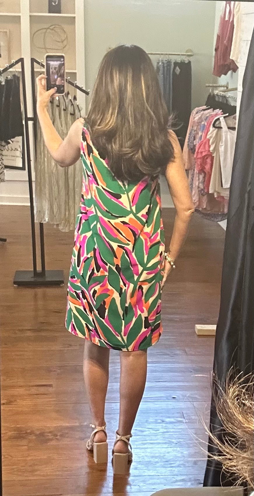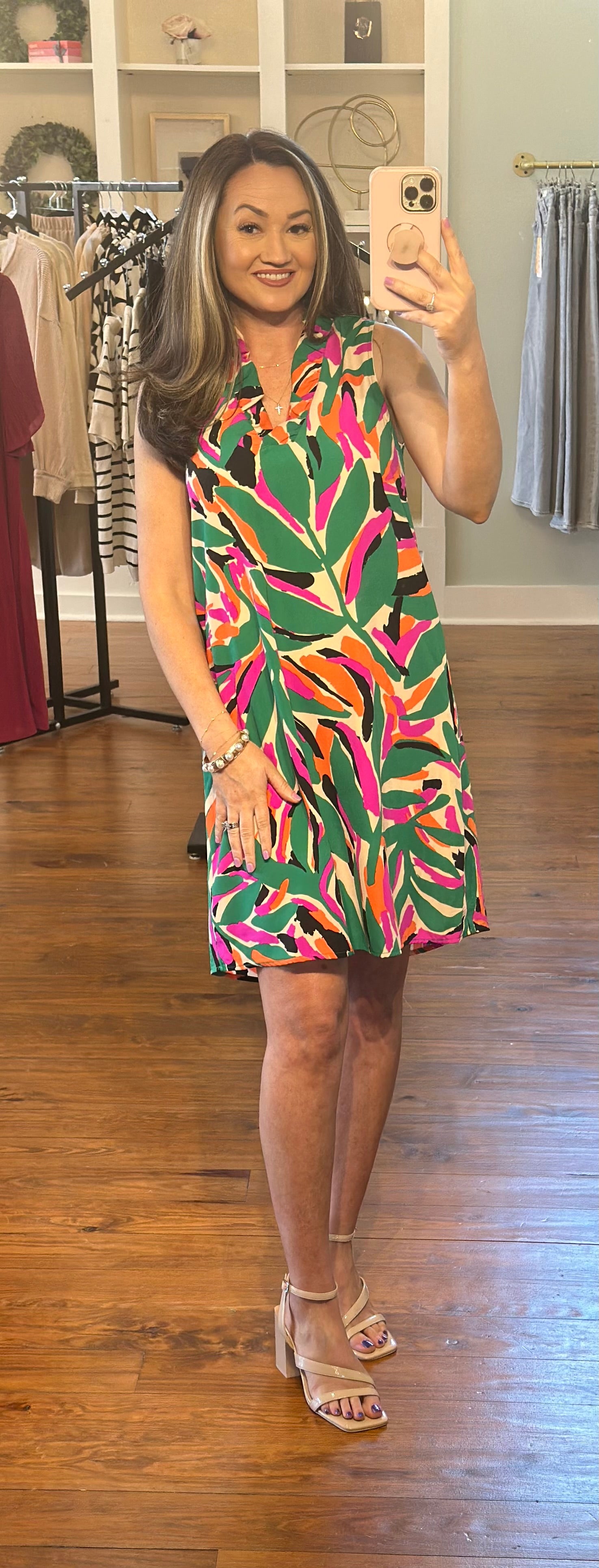 PRINTED SLEEVELESS WOVEN DRESS WITH RUFFLE COLLAR AND LINING